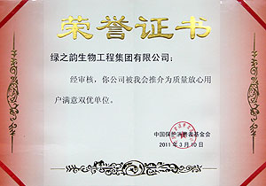 2011年“3?15”國(guó)際保護(hù)消費(fèi)者權(quán)益日之際,中國(guó)保護(hù)消費(fèi)者基金會(huì)根據(jù)《消費(fèi)者權(quán)益保護(hù)法》所賦予的職能和職責(zé),以“誠(chéng)信、維權(quán)”為年度消費(fèi)主題而組織的“全國(guó)市場(chǎng)放心消費(fèi)單位”評(píng)比活動(dòng)揭榜。綠之韻集團(tuán)認(rèn)真貫徹執(zhí)行《消費(fèi)者權(quán)益保護(hù)法》、《產(chǎn)品質(zhì)量法》,嚴(yán)格按照國(guó)家的行業(yè)規(guī)定與質(zhì)量標(biāo)準(zhǔn)組織生產(chǎn),經(jīng)過活動(dòng)組織方及國(guó)家相關(guān)部門的層層審查,被中國(guó)保護(hù)消費(fèi)者基金會(huì)授予“全國(guó)市場(chǎng)放心消費(fèi)單位”。