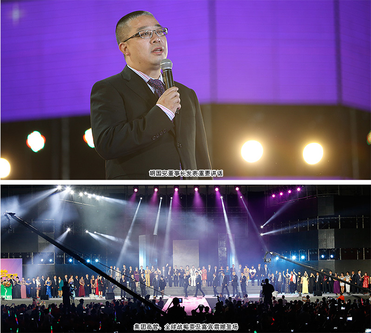 在全場熱烈的掌聲和歡呼聲中,胡國安董事長在耀眼光束聚焦下,乘坐“綠之韻號”專機降落到舞臺中心,發(fā)表了熱情洋溢的重要講話?!?014年這個星光燦爛的夜晚,你們開心嗎?首先請允許我代表綠之韻集團向長期關心和支持綠之韻事業(yè)發(fā)展的各位領導嘉賓、媒體朋友和家人們致以真誠的感謝和誠摯的問候。2014年習近平總書記勵精圖治,開啟了中國夢的嶄新篇章;一個月前,阿里美國上市,誕生了300位以上的億萬富翁,上萬計的千萬富翁,開啟了電商的嶄新篇章。2014年在所有綠之韻家人的努力下,綠之韻夢想啟迪未來的全國巡回演講如火如荼;一個月前,綠之韻上海全球連鎖酒店成功奠基,未來全國30家全球連鎖酒店將成為廣大營銷伙伴的培訓中心。還有茶文化高端會所,連鎖餐飲……綠之韻所做的這一切,就是為了給廣大營銷伙伴打造最優(yōu)秀的創(chuàng)業(yè)平臺,幫助每一個綠之韻人實現不同階段的夢想。今天來到現場的朋友都懷著和我一樣的夢想。我來自雪峰山下,我兒時的夢想是走出山村,讓父母過上幸福的生活;上大學后,我讓父母過上了幸福的生活,并萌發(fā)了創(chuàng)業(yè)的夢想。2003年,我創(chuàng)辦了綠之韻,致力于將它發(fā)展合法的、知名的民族企業(yè)。在領導們的支持和伙伴們的努力下,綠之韻成為了全國第26家拿牌直銷企業(yè),成為了民族企業(yè)的驕傲。我現在的夢想是在未來10年,我的有生之年,一是讓每一個綠之韻人都能成為家人的驕傲和家族的榜樣,二是讓每一個和綠之韻合作的伙伴、廠商能夠成為其所在產業(yè)領域的領頭羊,三是能夠帶領綠之韻沖出亞洲,走向世界。只要相信和堅持,所有的夢想一定能實現。祝所有的綠之韻人都能夢想成真!”