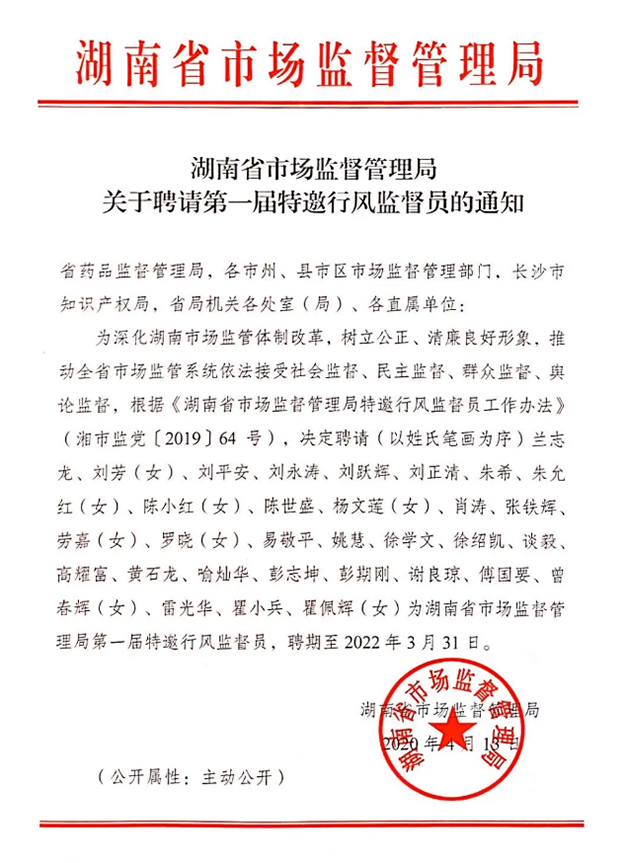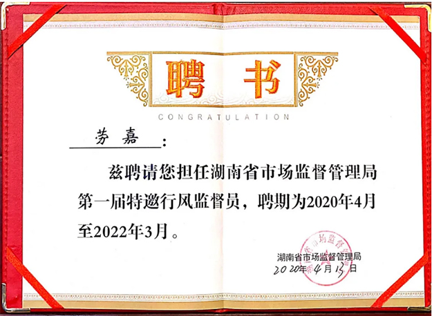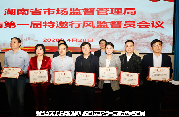 受聘為湖南省市場監(jiān)督管理局第一屆特邀行風(fēng)監(jiān)督員,勞嘉總裁表示:特邀行風(fēng)監(jiān)督員這個聘書沉甸甸的,不僅是一種光榮,更有一種神圣的使命感和責(zé)任感。我一定不辜負(fù)省市場監(jiān)督管理局的期望,不辜負(fù)廣大民眾的重托,爭做稱職的、優(yōu)秀的監(jiān)督員,并充分發(fā)揮好參謀咨詢、橋梁紐帶、輿論引導(dǎo)作用,依法依規(guī)履行市場監(jiān)管系統(tǒng)行風(fēng)建設(shè)監(jiān)督職責(zé),為新形勢下市場監(jiān)督工作建言獻(xiàn)策,為我省市場監(jiān)管工作和隊(duì)伍建設(shè)作出積極貢獻(xiàn)。