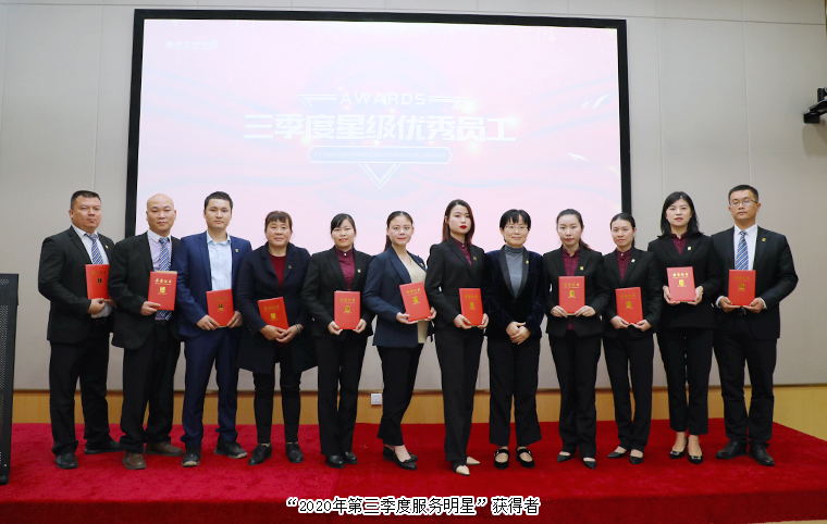 為表彰先進(jìn)、凝聚力量,進(jìn)一步激勵(lì)全體員工的積極性和奮斗激情,大會(huì)集中頒發(fā)了“三季度優(yōu)秀服務(wù)集體”“三季度服務(wù)明星”“五年服務(wù)英才獎(jiǎng)”“十年服務(wù)忠誠(chéng)獎(jiǎng)”等獎(jiǎng)項(xiàng)。傭金結(jié)算中心、新聞信息中心榮獲“2020年第三季度優(yōu)秀服務(wù)集體”稱號(hào),喻鳴鸞、靳威、楊邢軒、李向宇、王雪、牛小紅、戴明玉、林智文、李思、夏丹、劉偉、李克戰(zhàn)、戴明勇、蘇銅、肖巧林被評(píng)為“2020年第三季度星級(jí)優(yōu)秀員工”,綠之韻集團(tuán)副總裁劉淑娟、總經(jīng)理劉維利為獲獎(jiǎng)部門代表及個(gè)人頒獎(jiǎng)。肖波、曾夢(mèng)繁、朱麗妍、張婭、蘇妍、陳苗、張煜軒、劉博、吳冬梅、李星麗、牛小紅、孟慶玲、袁新星、張琳、鄧金林、劉伏海榮膺“五年服務(wù)英才獎(jiǎng)”,張曉芳、周金霖、盛夏、高素丹、彭姣、高芳榮膺“十年服務(wù)忠誠(chéng)獎(jiǎng)”,綠之韻集團(tuán)董事總裁勞嘉、副總裁胡均安先后上臺(tái)為獲獎(jiǎng)員工頒發(fā)獎(jiǎng)?wù)屡c榮譽(yù)證書,并致以熱烈祝賀?!拔迥攴?wù)英才獎(jiǎng)”代表肖波和“十年服務(wù)忠誠(chéng)獎(jiǎng)”代表周金霖分別發(fā)表獲獎(jiǎng)感言。