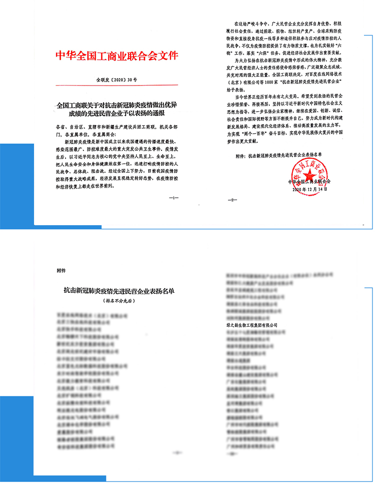近日,全國(guó)工商聯(lián)發(fā)布《關(guān)于對(duì)抗擊新冠肺炎疫情做出優(yōu)異成績(jī)的先進(jìn)民營(yíng)企業(yè)予以表?yè)P(yáng)的通報(bào)》,對(duì)1000家“抗擊新冠肺炎疫情先進(jìn)民營(yíng)企業(yè)”給予表?yè)P(yáng)。綠之韻集團(tuán)充分發(fā)揮自身優(yōu)勢(shì),積極履行社會(huì)責(zé)任,通過(guò)捐款、捐物、組織采購(gòu)防疫物資支援抗疫一線(xiàn)等多種途徑積極參與應(yīng)對(duì)疫情防控的人民戰(zhàn)爭(zhēng)而榮獲表彰。