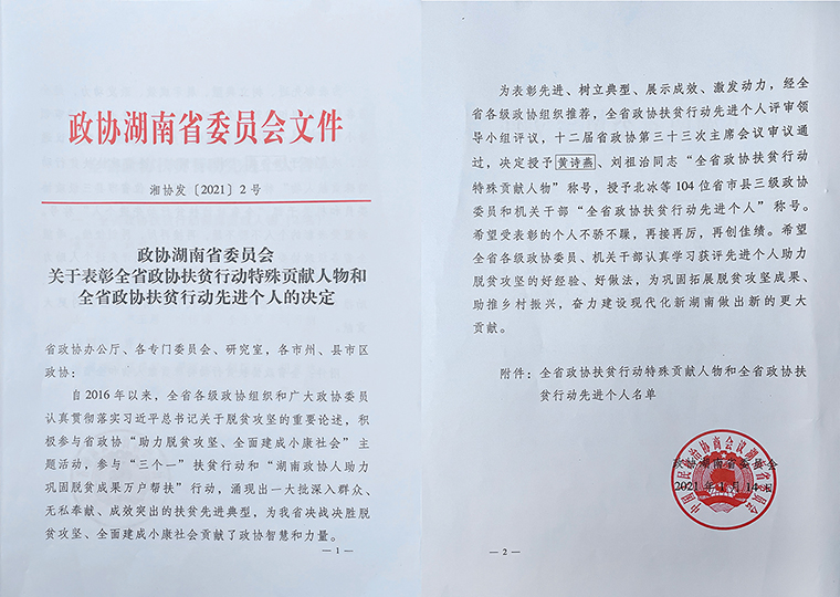 慈心厚德,善舉為民。胡國安委員表示,榮譽在身,責任在肩。今后,將繼續(xù)在省政協(xié)的指導和部署下,認真履行委員職責,積極投身湖南“三高四新”戰(zhàn)略的恢弘征程,為鞏固拓展脫貧攻堅成果、助推鄉(xiāng)村振興、加快建設(shè)富饒美麗幸福新湖南做出新的更大貢獻。
