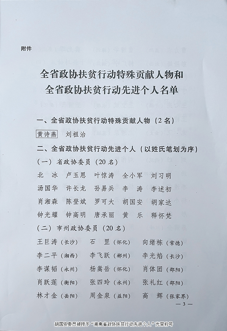 開幕會上,湖南省政協(xié)副主席賴明勇宣讀了全省政協(xié)扶貧行動先進個人表彰決定。據(jù)了解,自2016年以來,全省各級政協(xié)組織和廣大政協(xié)委員積極參與省政協(xié)“助力脫貧攻堅、全面建成小康社會”主題活動,參與“三個一”扶貧行動和“湖南政協(xié)人助力鞏固脫貧成果萬戶幫扶”行動,涌現(xiàn)出一大批深入群眾、無私奉獻、成效突出的扶貧先進典型,為我省決戰(zhàn)決勝脫貧攻堅、全面建成小康社會貢獻了政協(xié)智慧和力量。為表彰先進、樹立典型、展示成效、激發(fā)動力,經(jīng)全省各級政協(xié)組織推薦,全省政協(xié)扶貧行動先進個人評審領(lǐng)導小組評議,省政協(xié)主席會議審議通過,決定授予胡國安委員等20位省政協(xié)委員以及84位市縣政協(xié)委員、機關(guān)干部“全省政協(xié)扶貧行動先進個人”稱號。