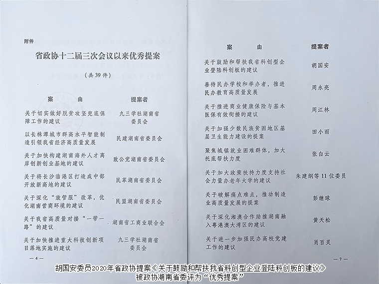 胡國安委員2020年提交的政協(xié)提案《關(guān)于鼓勵和幫扶我省科創(chuàng)型企業(yè)登陸科創(chuàng)板的建議》被政協(xié)湖南省委員會評為“優(yōu)秀提案”。作為一名三屆省政協(xié)“老委員”,胡國安委員廣泛傾聽社情民意、積極參與各種形式的調(diào)研活動,為省市實體經(jīng)濟發(fā)展獻計獻策。自履職以來,他積極參政議政,共計提交了近40份有價值的政協(xié)提案,其中所提交的《關(guān)于加快我省電業(yè)園建設(shè)的建議》《關(guān)于推進“互聯(lián)網(wǎng)+精準扶貧”的建議》等提案,引起媒體廣泛關(guān)注。2010年,被省政協(xié)授予“優(yōu)秀政協(xié)委員”光榮稱號,2016年《關(guān)于推進“互聯(lián)網(wǎng)+精準扶貧”的建議》提案榮獲省政協(xié)“優(yōu)秀提案”表彰。2018年,代表致公黨湖南省委提交的《關(guān)于主動對接融入粵港澳大灣區(qū),加快推進長沙空鐵經(jīng)濟示范區(qū)的建議》提案,獲中共湖南省委書記許達哲重要批示。今年兩會,胡國安委員向省政協(xié)提交了《依托中醫(yī)藥產(chǎn)業(yè),推進我省中醫(yī)醫(yī)院治未病中心建設(shè)》和《關(guān)于進一步推進我省疾病預防控制事業(yè)發(fā)展的建議》兩份提案。