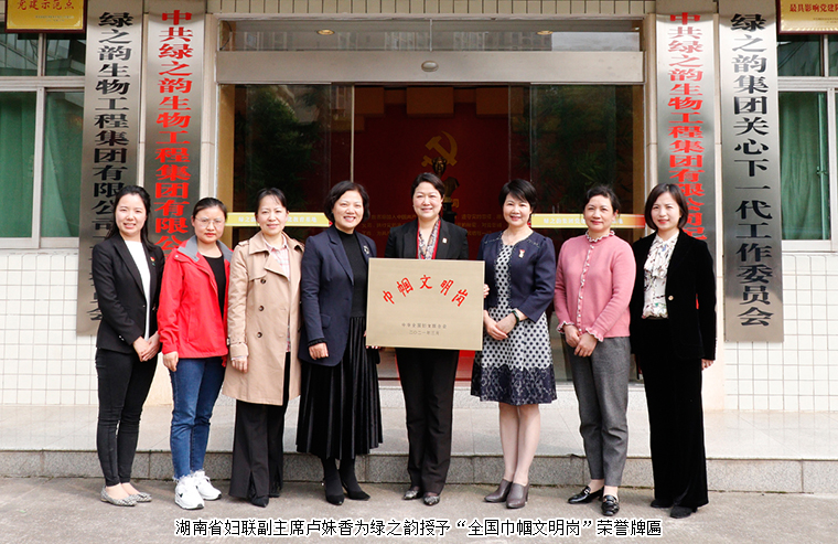 2021年3月29日,湖南省婦聯(lián)副主席盧妹香、省婦聯(lián)婦女發(fā)展部部長(zhǎng)陳敏、省婦女兒童發(fā)展基金會(huì)辦公室主任湯鳳英、省婦聯(lián)婦女發(fā)展部三級(jí)主任科員符靚等一行蒞臨綠之韻集團(tuán),為綠之韻授予“全國(guó)巾幗文明崗”榮譽(yù)牌匾。綠之韻集團(tuán)董事、總裁勞嘉,黨委書(shū)記劉云,工會(huì)主席兼集團(tuán)辦公室行政總監(jiān)馮紅參與授牌儀式。