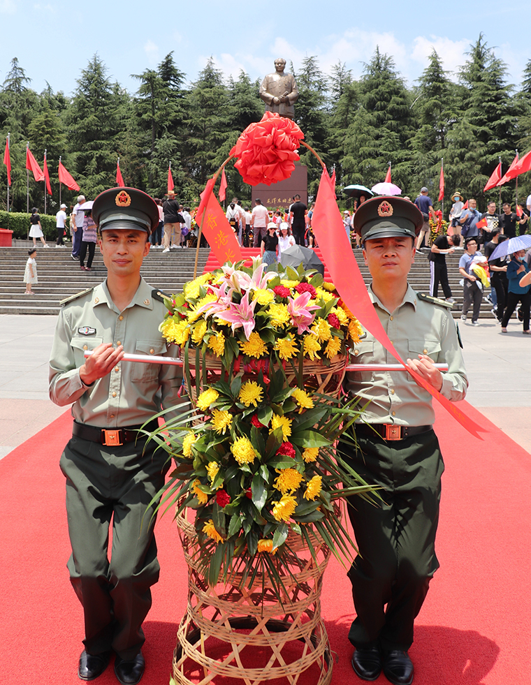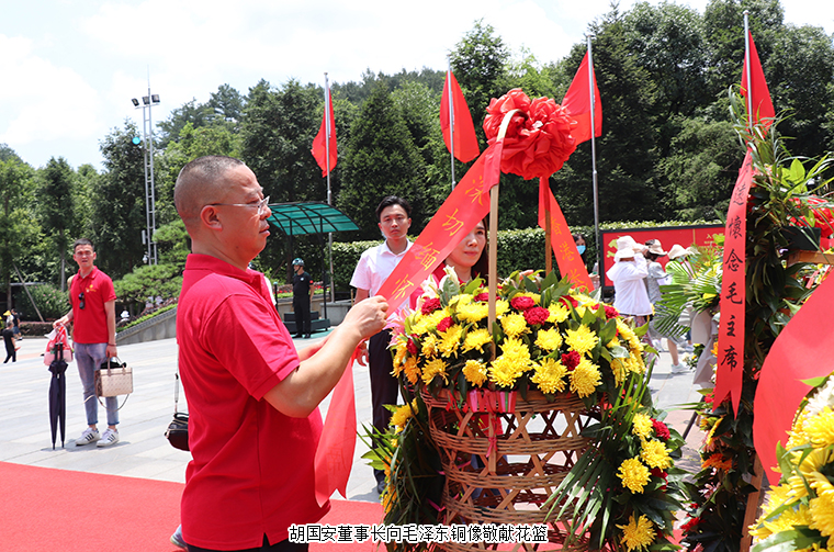 在現(xiàn)場(chǎng)工作人員的帶領(lǐng)下,一行人來到毛澤東銅像廣場(chǎng),瞻仰偉大的毛主席。毛主席銅像立于高高的紅色花崗巖石基座上,背靠韶峰,主席身軀偉岸,手握書卷,雙眼炯炯有神,面帶微笑地注視遠(yuǎn)方。大家表情莊嚴(yán)肅穆,整齊有序地排著隊(duì)列,懷著無比崇敬的心情,向毛主席銅像敬獻(xiàn)花籃,每個(gè)人都自發(fā)自覺地用自己的方式懷念著這位偉大的領(lǐng)袖。