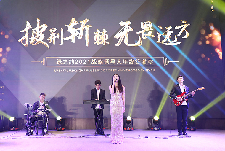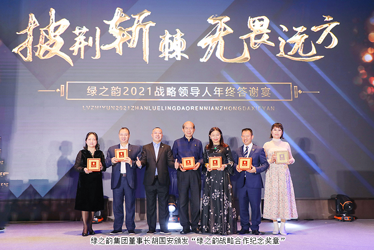 晚宴以“披荊斬棘·無畏遠(yuǎn)方”為主題。晚宴伊始,綠之韻集團(tuán)董事、總裁勞嘉致辭。她首先代表集團(tuán)公司對各位嘉賓、各位市場優(yōu)秀領(lǐng)導(dǎo)人的到來致以熱烈的歡迎和誠摯的問候!衷心感謝每一位新老朋友的努力和堅持,讓綠之韻這個品牌,在這個特殊的年份,不僅克服了重重困難,而且還取得了良性增長。即將邁入嶄新的2022,這將是我們鑒機(jī)識變、化危為贏、擼起袖子、彎道超車的一年。她堅信:任何困難、任何險阻、任何風(fēng)雨并不可怕,只要綠之韻人在一起,就會更有力量;只要我們披荊斬棘,無畏遠(yuǎn)方,心手相牽,明天就一定會更美好!