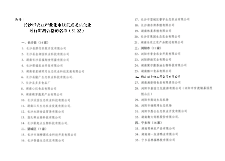 近日,按照《長(zhǎng)沙市農(nóng)業(yè)產(chǎn)業(yè)化重點(diǎn)龍頭企業(yè)申報(bào)認(rèn)定和運(yùn)行監(jiān)測(cè)管理辦法》的規(guī)定,市農(nóng)業(yè)農(nóng)村局于 2021?年組織對(duì)《長(zhǎng)沙市農(nóng)業(yè)農(nóng)村局關(guān)于認(rèn)定長(zhǎng)沙市農(nóng)業(yè)產(chǎn)業(yè)化重點(diǎn)龍頭企業(yè)的通知》認(rèn)定的61家農(nóng)業(yè)產(chǎn)業(yè)化市級(jí)龍頭企業(yè)運(yùn)行情況進(jìn)行了監(jiān)測(cè)。在各縣(市)初步監(jiān)測(cè)的基礎(chǔ)上,經(jīng)市農(nóng)業(yè)農(nóng)村局審定并網(wǎng)上公示,綠之韻生物工程集團(tuán)有限公司等51家企業(yè)為運(yùn)行監(jiān)測(cè)合格企業(yè),再次被認(rèn)定為“長(zhǎng)沙市農(nóng)業(yè)產(chǎn)業(yè)化重點(diǎn)龍頭企業(yè)”。