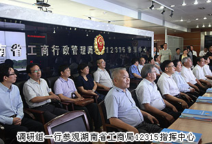 在湖南省工商局黨組書記、局長李金冬的陪同下,調(diào)研組一行首先來到湖南省工商行政管理局12315指揮中心聽取了關(guān)于湖南工商12315指揮系統(tǒng)的工作匯報。湖南工商12315指揮系統(tǒng)是工商機關(guān)受理消費者申訴舉報,調(diào)解消費糾紛,查處侵權(quán)案件,加強市場監(jiān)督的維權(quán)熱線,分為大屏幕拼接顯示墻系統(tǒng)、LED顯示屏系統(tǒng)和可視調(diào)度指揮系統(tǒng)等三個子系統(tǒng)。采用高清晰數(shù)字顯示、多屏圖像處理、網(wǎng)絡(luò)技術(shù)等科技手段,為12315指揮調(diào)度提供了網(wǎng)絡(luò)監(jiān)控、信息共享、數(shù)據(jù)分析和業(yè)務(wù)保障的綜合平臺。湖南省政協(xié)主席陳求發(fā)指出,一定不斷加強和改進消費維權(quán)工作,不斷拓展維權(quán)功能,努力把12315打造成經(jīng)濟領(lǐng)域的“110”,化解矛盾的“接訪點”,消費維權(quán)的“保護神”,工商形象的“展示窗”。