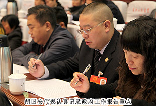開幕式后,中共湖南省委常委、市委書記易煉紅,中共長沙市委副書記、長沙市人民政府市長胡衡華一行來到各地區(qū)代表團(tuán),與出席市十四屆人大二次會(huì)議的代表們一起審議政府工作報(bào)告,聽取代表們的建議和意見。在瀏陽市代表團(tuán)分組審議座談會(huì)上,就2014年長沙經(jīng)濟(jì)社會(huì)如何保持平穩(wěn)快速發(fā)展,代表們紛紛獻(xiàn)計(jì)獻(xiàn)策。中共長沙市委副書記、長沙市人民政府市長胡衡華,長沙市人大常委會(huì)副主任黃佳惠,長沙市人民政府副市長、瀏陽市委書記曹立軍等市領(lǐng)導(dǎo)成員仔細(xì)傾聽每位代表發(fā)言,認(rèn)真記錄,還不時(shí)一起探討。胡國安代表在審議時(shí)針對胡市長在講話中提到的“全力打造瀏陽河生態(tài)經(jīng)濟(jì)示范區(qū),把瀏陽經(jīng)開區(qū)培育成新的千億園區(qū)”和“加快移動(dòng)電子商務(wù)基地建設(shè),促進(jìn)電子商務(wù)加速發(fā)展,爭創(chuàng)國家電子商務(wù)示范基地”的兩個(gè)觀點(diǎn),他結(jié)合園區(qū)、綠之韻集團(tuán)實(shí)際,詳盡闡述了綠之韻集團(tuán)的生態(tài)經(jīng)濟(jì)發(fā)展思路,以及在瀏陽河與撈刀河畔建立生態(tài)休閑區(qū)、建設(shè)五星級(jí)生態(tài)酒店和綠之韻連鎖酒店、發(fā)展湖南黑茶產(chǎn)業(yè)、打造藍(lán)莓產(chǎn)業(yè)鏈等未來八大發(fā)展規(guī)劃。胡衡華、黃佳惠、曹立軍等省市領(lǐng)導(dǎo)認(rèn)真聆聽胡國安代表的發(fā)言,邊聽邊記,邊記邊問,對發(fā)言中提及的思路和做法表示高度的肯定。由于胡國安代表長期扎根基層,服務(wù)群眾,盡職履責(zé),深入調(diào)研,連續(xù)兩屆擔(dān)任人大代表,所提交的議案均緊扣社會(huì)熱點(diǎn)和難點(diǎn),普遍反映比較強(qiáng)烈,長沙市人民政府副市長、瀏陽市委書記曹立軍對此印象十分深刻。分組審議后,曹立軍副市長立軍同胡國安代表進(jìn)行了面對面的親切交談。他向胡國安代表不久前獲評“長沙市優(yōu)秀人大代表典型風(fēng)采人物”表示祝賀,希望胡國安代表進(jìn)一步發(fā)揮出人大代表參與決策、監(jiān)督協(xié)助、橋梁紐帶的作用,為長沙全面推進(jìn)“六個(gè)走在前列”、率先建成“三市”、強(qiáng)力實(shí)施“三倍”、加快現(xiàn)代化進(jìn)程,作出更大的貢獻(xiàn)!